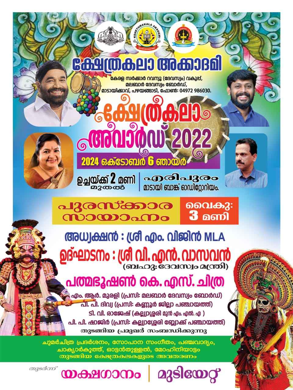 2024 ഒക്ടോബർ 6 ഞായറാഴ്ച ഉച്ചയ്ക്ക് 2 മണി മുതൽ മാടായി ബാങ്ക് ഓഡിറ്റോറിയം, എരിപുരം നടക്കും. കല്ലാശ്ശേരി എംഎൽഎ എം.വിജിൻ MLA അധ്യക്ഷത വഹിക്കുന്ന ചടങ്ങിൽ ദേവസ്വം വകുപ്പ് മന്ത്രി വി.എൻ. വാസവൻ ഉദ്ഘാടനം നിർവഹിക്കും. പത്മഭൂഷൻ കെ.എസ്.ചിത്ര, മലബാർ ദേവസ്വം ബോർഡ് പ്രസിഡണ്ട് എം.ആർ.മുരളി, ജില്ലാ പഞ്ചായത്ത് പ്രസിഡണ്ട് പി.പി.ദിവ്യ, ടി.വി.രാജേഷ് , ക്ഷേത്ര കലാ അക്കാദമി സെക്രട്ടറി കൃഷ്ണൻ നടുവലത്ത് തുടങ്ങിയവർ സംബന്ധിക്കും. പുരസ്കാര വിതരണവും ചാക്യാർകൂത്ത്, ഓട്ടൻതുള്ളൽ മോഹിനിയാട്ടം , യക്ഷഗാനം തുടങ്ങിയ കലകൾ അരങ്ങേറും.
